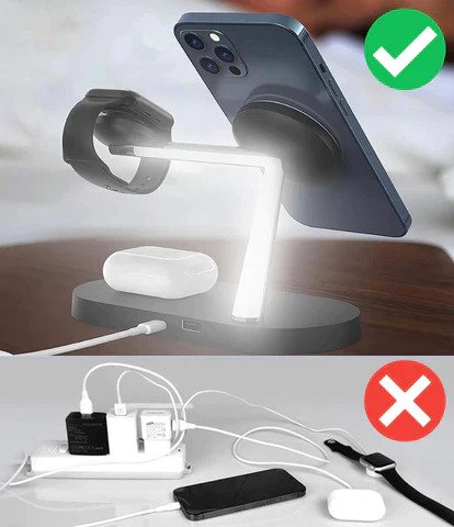 Z brezžičnim polnilnikom 5 v 1 se poslovite od težav in stroškov z nakupom polnilnih kablov in adapterjev. Ta vsestranska naprava omogoča hkratno polnjenje pametnega telefona, ure in slušalk, ponuja pa celo možnost polnjenja drugega pametnega telefona namesto slušalk.