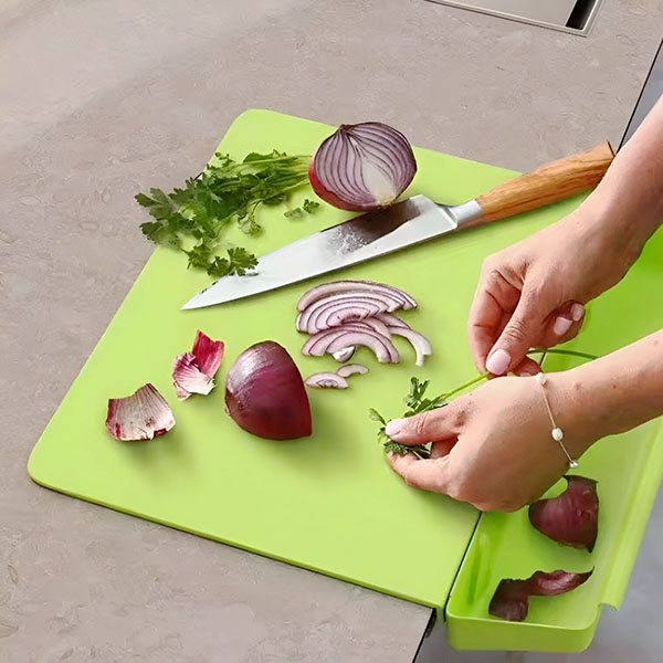 Naj bo vaša kuhinja urejena in učinkovita! 🍅🍴 Snemljiva posoda te deske za rezanje omogoča zajemanje vseh nasekljanih sestavin, kar olajša pripravo obroka in prihrani čas pri čiščenju. 🧽✨ Poslovite se od nereda na pultu!