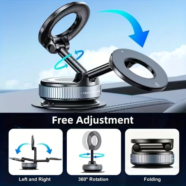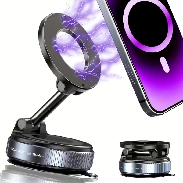 Držalo za telefon MAGHOLDZ uporablja močan vakuumski oprijem, ki se z vibracijami še okrepi in varno drži vaš telefon na gladkih površinah, ne da bi pustil sledi na steklu, armaturni plošči ali mizi.