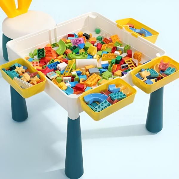 Miza je uporabna na obeh straneh, pri čemer je ena stran namenjena sestavljanju blokov, druga pa ima ravno površino.