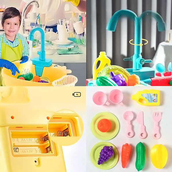 Umivalnik ima pravo tekočo vodo, zato je igra podobna resnični. Tekoča voda dodaja vznemirljiv pridih, ki otrokom pomaga raziskovati in sodelovati z okoljem okoli sebe skozi prizmo vsakdanjega življenja.