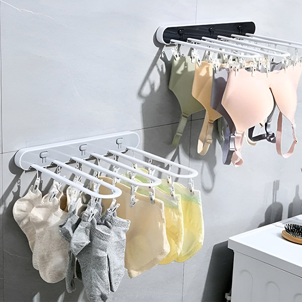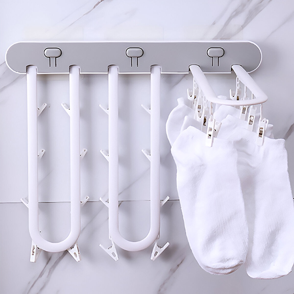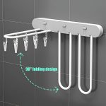 Z lepilom ga lahko prilepite na katerokoli ravno površino ali steno in posušite več majhnih predmetov – brez orodja ali vrtanja! Ko stojalo ni v uporabi, se zloži ob steno in tako prihrani prostor v kopalnicah, na balkonih ali v pralnicah.